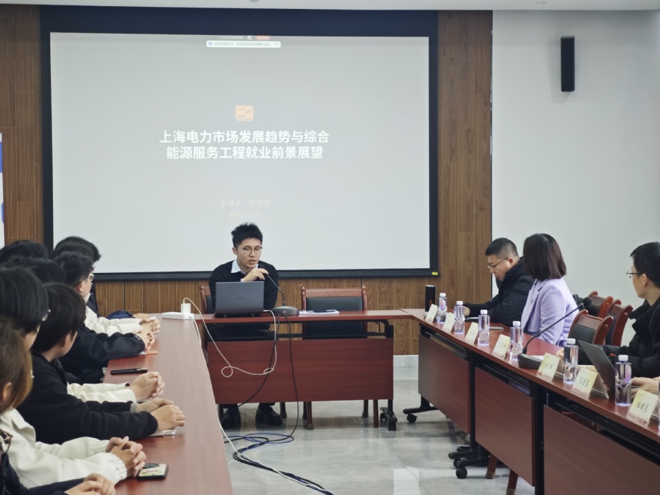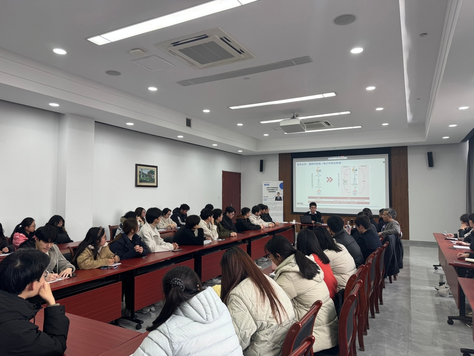 致辞结束后,专题讲座正式开讲。应文灏先生以能源转型背景下的电力市场变革与就业机遇为核心,围绕人工智能赋能电力市场、上海电力市场实操解析、综合能源服务职业发展三大方向展开分享。结合多年深耕电力市场交易一线的实战经验,专家系统梳理了上海电力市场的发展脉络与未来趋势,深入解析电力现货交易的实操流程与关键要点,让同学们直观了解电力交易业务的真实工作场景。同时,他重点介绍了人工智能技术在电力负荷预测、市场评估等领域的创新应用,生动阐释前沿技术如何赋能电力市场高效运行,帮助同学们精准把握技术变革带来的专业发展方向。