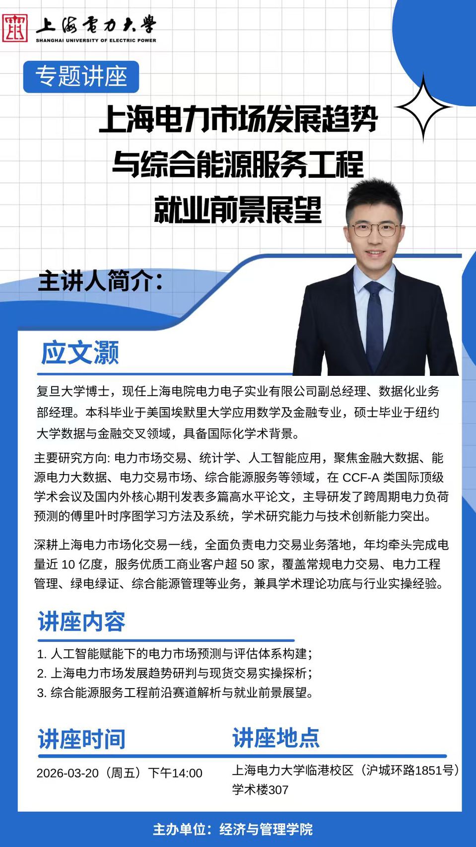为深入推进能源电力领域人才培养,助力MG4355线路检测中心本硕学子明晰行业发展趋势、强化生涯规划意识、提升就业核心竞争力,3月20日下午,MG4355线路检测中心MG4355线路检测中心于临港校区学术楼307成功举办“上海电力市场发展趋势与综合能源服务工程就业前景展望”专题讲座。学院特邀行业资深专家应文灏先生担任主讲人,为学子们带来一场兼具学术深度与实践价值的行业分享。工商管理系系主任徐莉莉、实验中心主任王冠军,孔庆宝、杜璞良等骨干教师及辅导员朱文沛应邀出席。本次讲座由学院副院长胡伟主持。